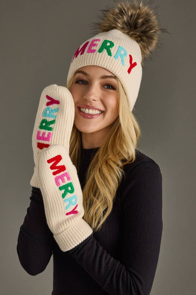 Beige mittens with multicolored textured "MERRY" on front