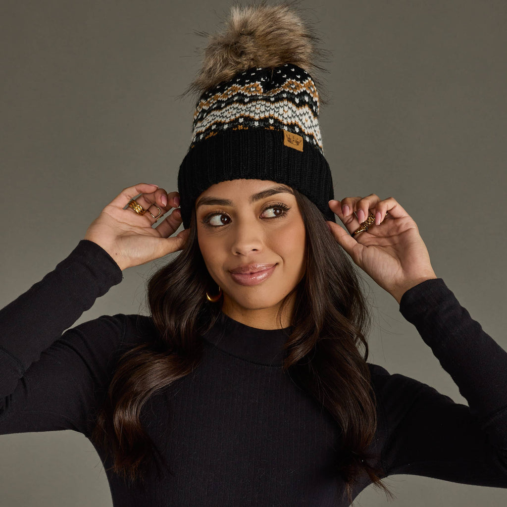 Black, white, mustard & blue patterned pom hat