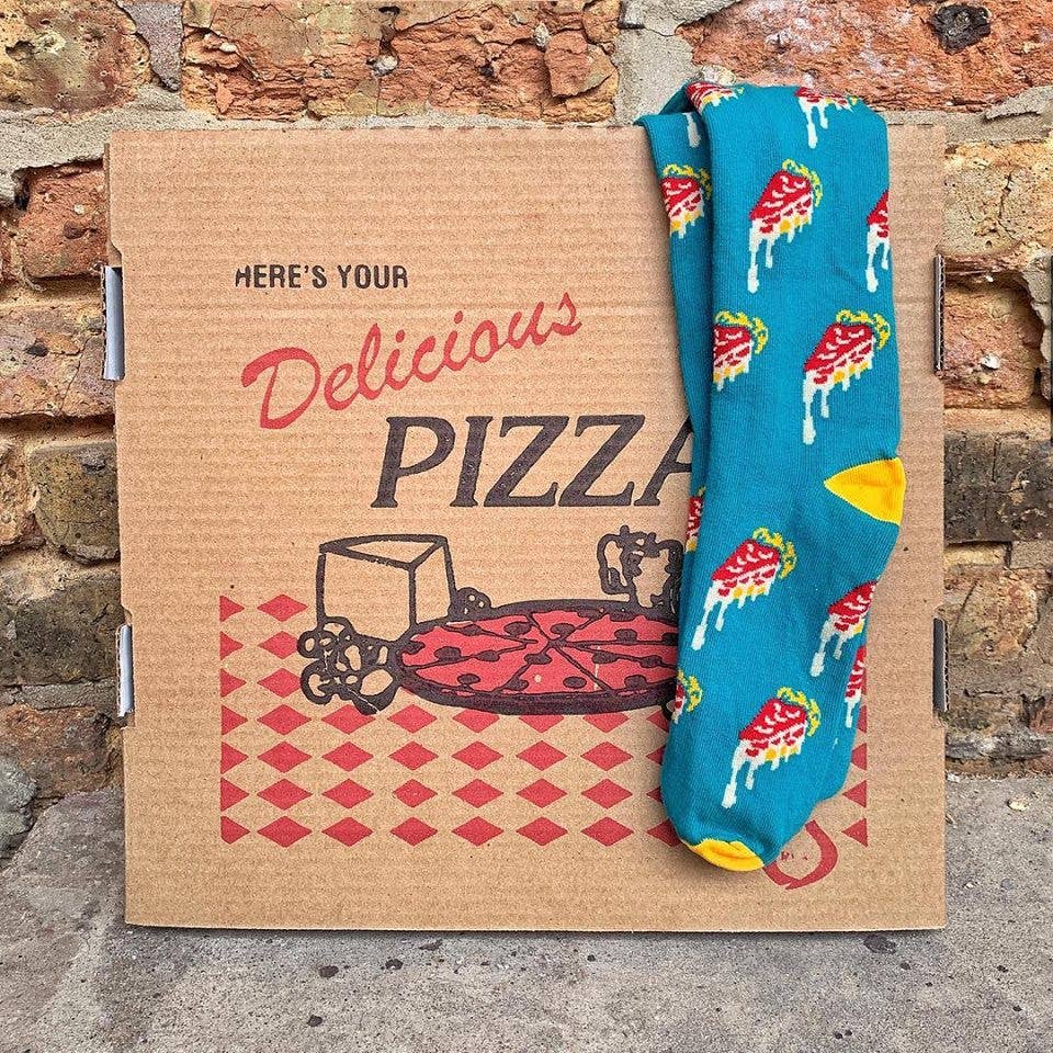 Keep your toes as toasty as a pizza fresh from the oven with our Deep Dish Pizza socks! They may look tasty, but please do not eat these, as the flavor profile of poly/cotton blend is not very similar to a buttery, crispy crust with gooey mozzarella.