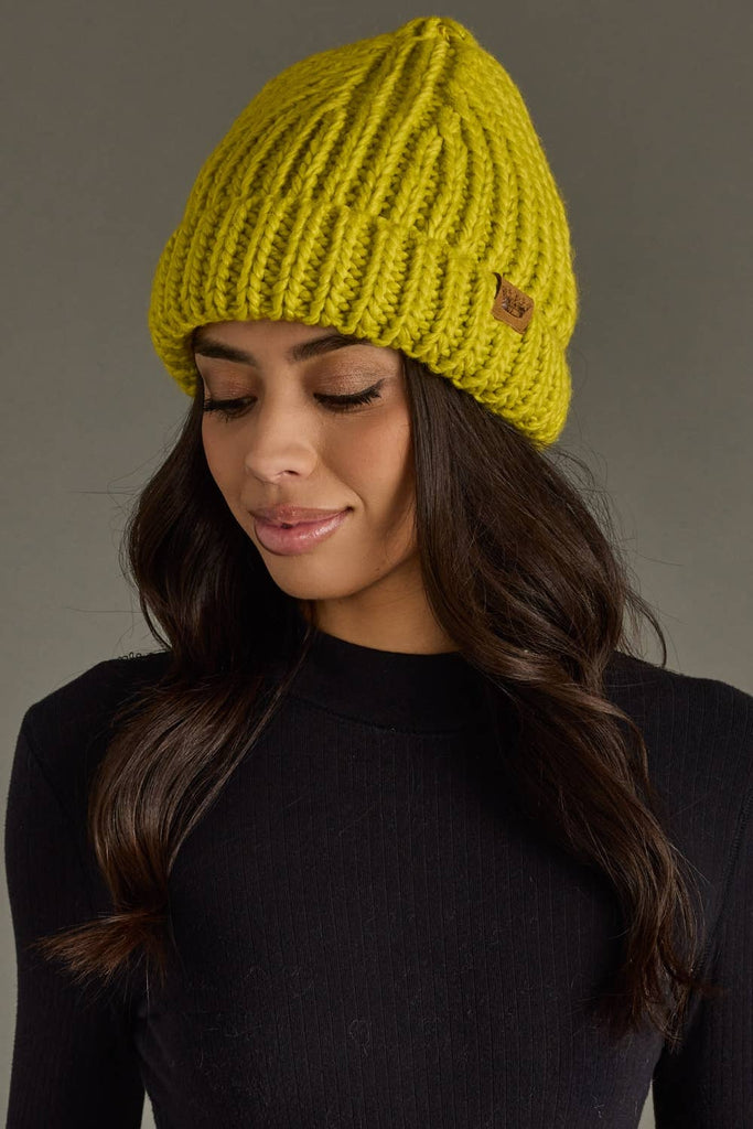 Muted lime green chunky knit cuffed beanie
