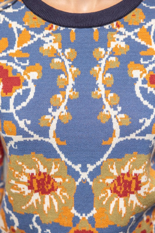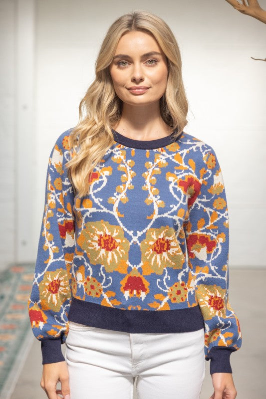This blue knit sweater showcases a bold floral and bird motif in warm autumn tones of gold, red, and olive. With long puff sleeves and a fitted ribbed hem, it blends comfort with standout style, making it perfect for fall and winter layering. A statement piece that pairs effortlessly with denim or tailored pants for a cozy yet eye-catching look.