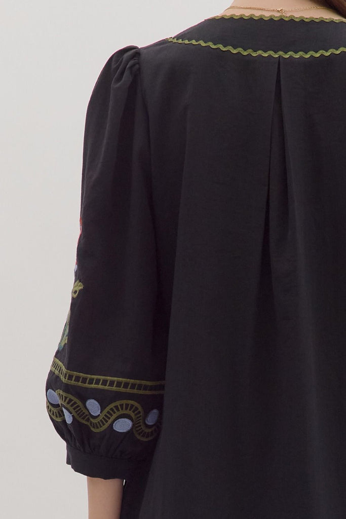 Solid 3/4 puff sleeve mini dress featuring embroidered floral and geometric sleeve and hem detail with scallop accent trim at neckline. Side pockets. Lined. Woven. Non-sheer. Lightweight.